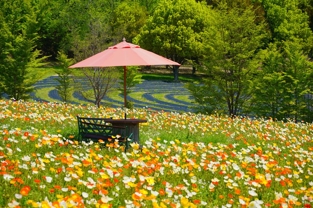 四季折々の花々が彩る広大な農場で、地元の美味を楽しむ