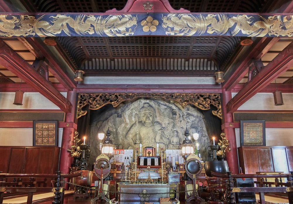 岸壁に刻まれた摩崖仏に祈りをささげる