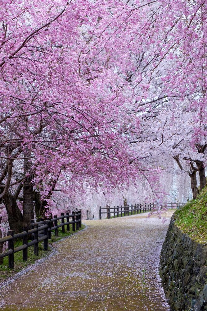 春の芝桜と圧巻の石垣が織りなす美しい風景