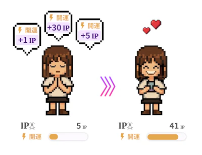 当webサイトでは、オンラインでのお祈りと、神社に訪れて参拝するオフラインのお祈りを、IP(祈りポイント)として蓄積していきます。